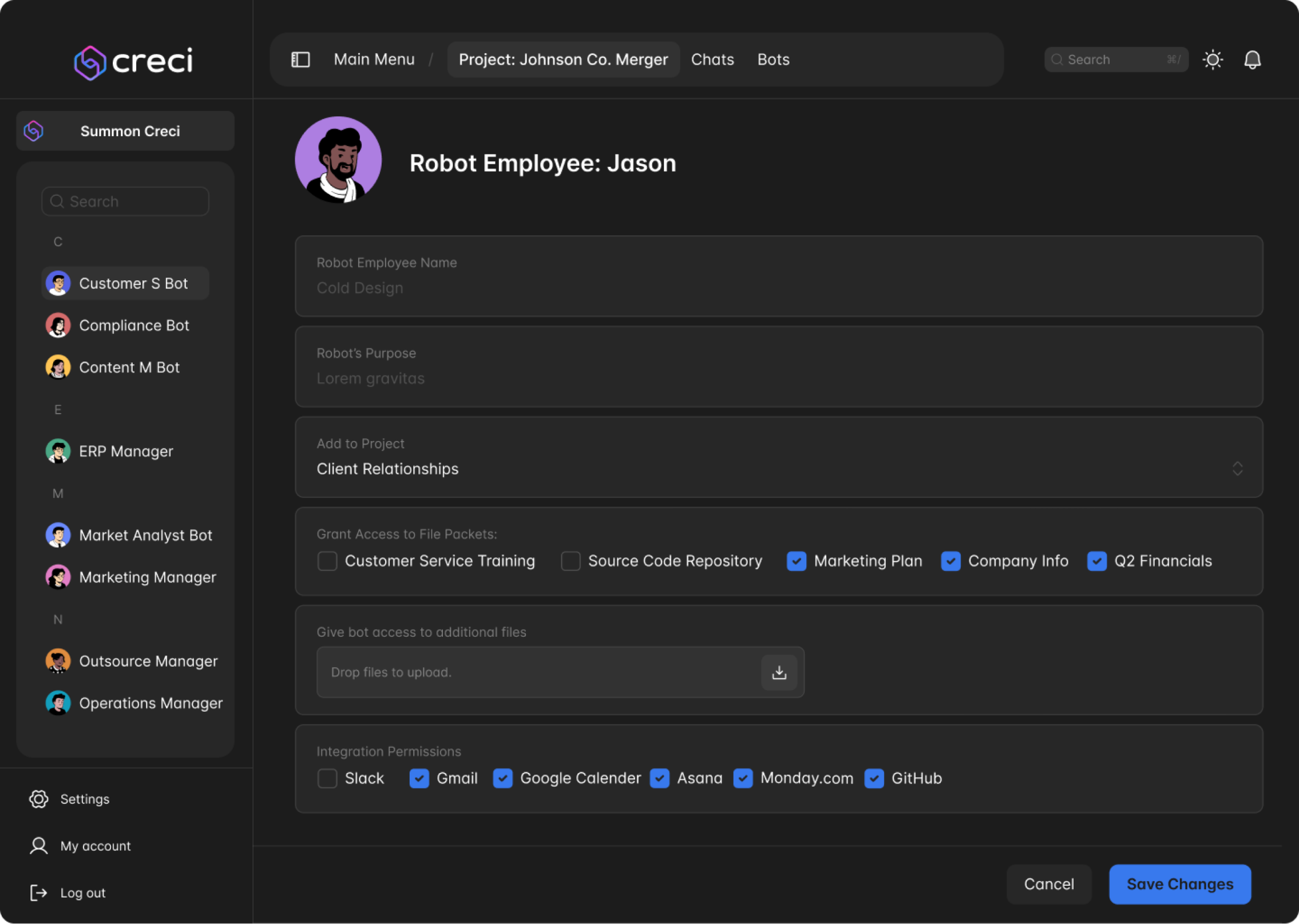 Users have the flexibility to upload various file formats for training bots, with the option to seamlessly link them to a database of company information as needed. Account admins and designated managers can grant bots access to secure file libraries in their company database. This instant access not only equips the bots with crucial context about the company's guidelines, protocols, and restrictions but also extends to uploading code repositories, financial records, industry-specific textbooks, and manuals, essentially enabling the AI to learn from any material a human can. The AI agents are designed for ongoing learning and development. Through active engagement with industry and company standards, they adapt and evolve over time, improving efficiency and productivity based on user interactions and feedback. Creci also allows users to personalize bots with unique names, distinct personalities, and specific departmental roles.