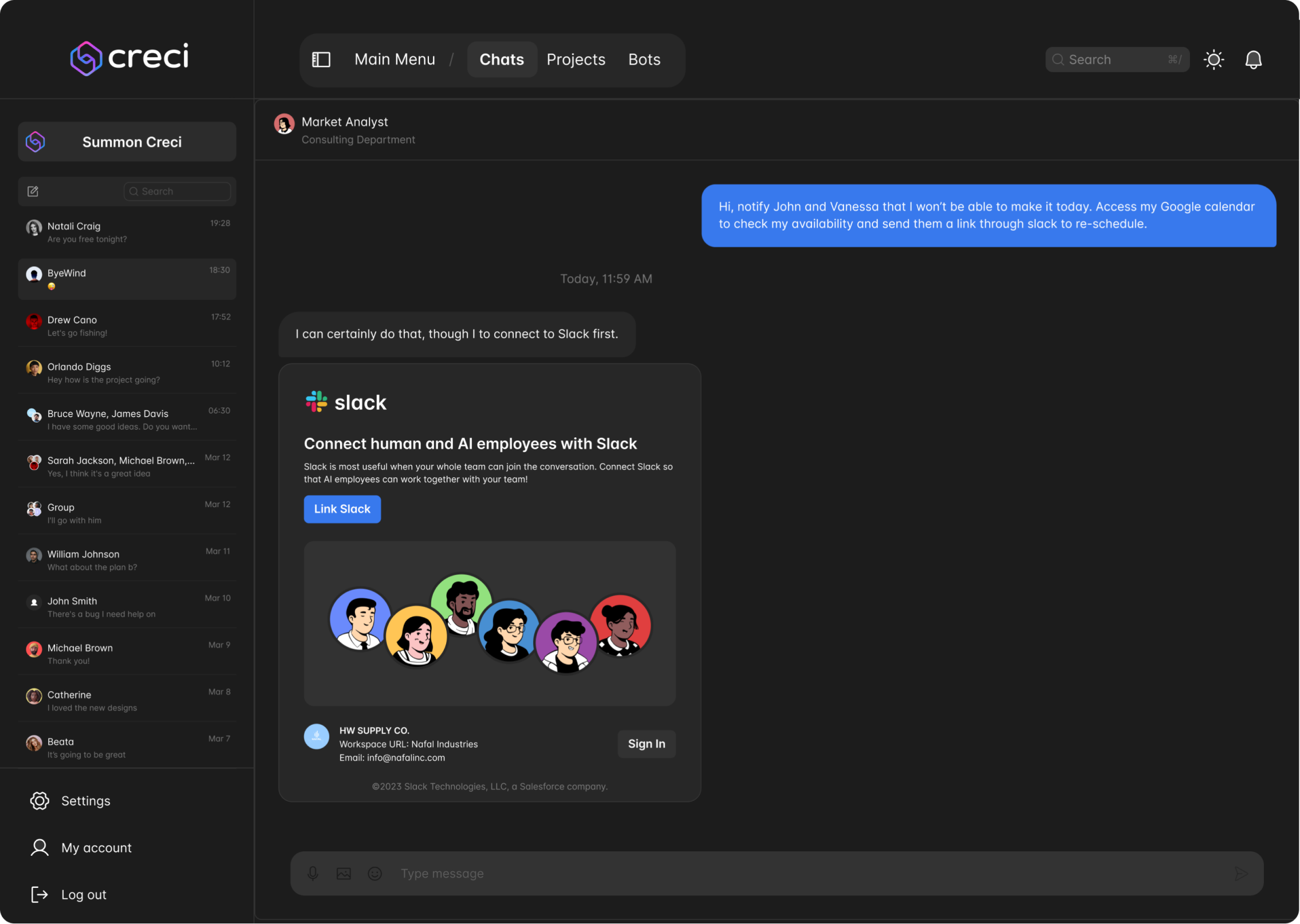 Their versatility extends to task management, where they facilitate effective collaboration with human employees and can autonomously handle tasks. As personal assistants, Creci's agents efficiently manage communications through Slack and Gmail and keep schedules organized using Google Calendar. These are just a few examples. The possibilities are truly endless and only limited by the availability of third-party API keys and one’s own imagination.