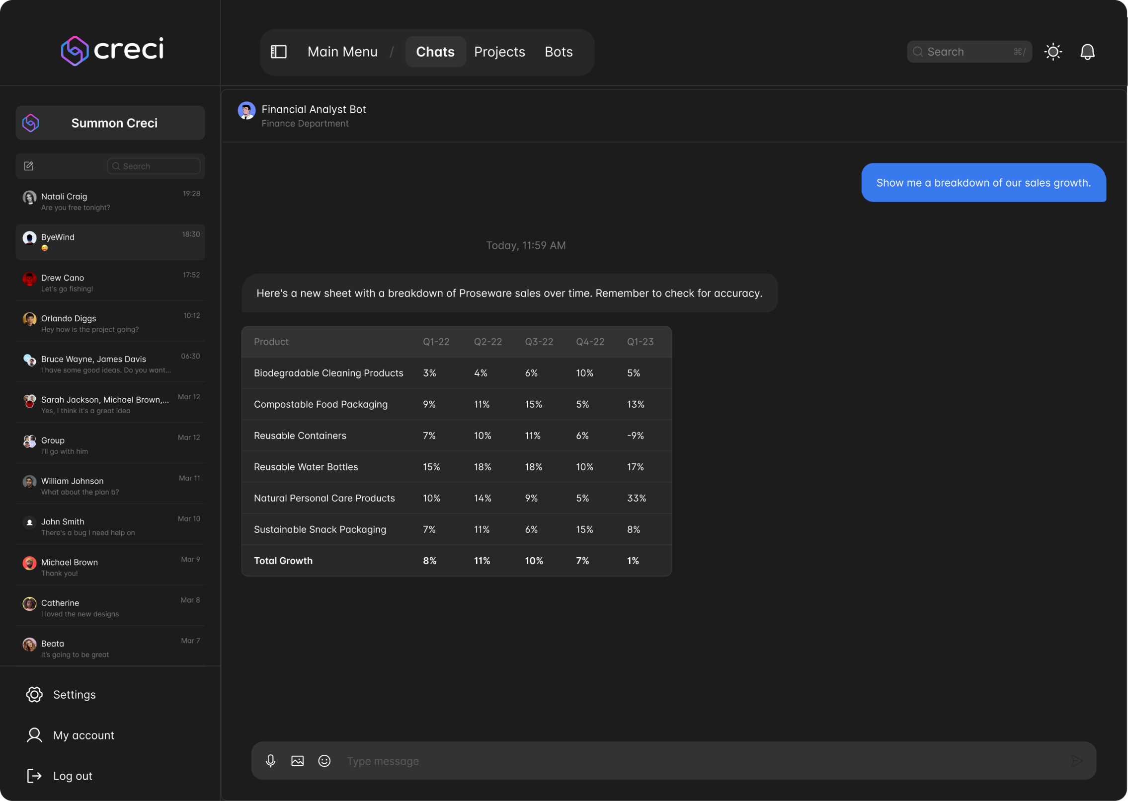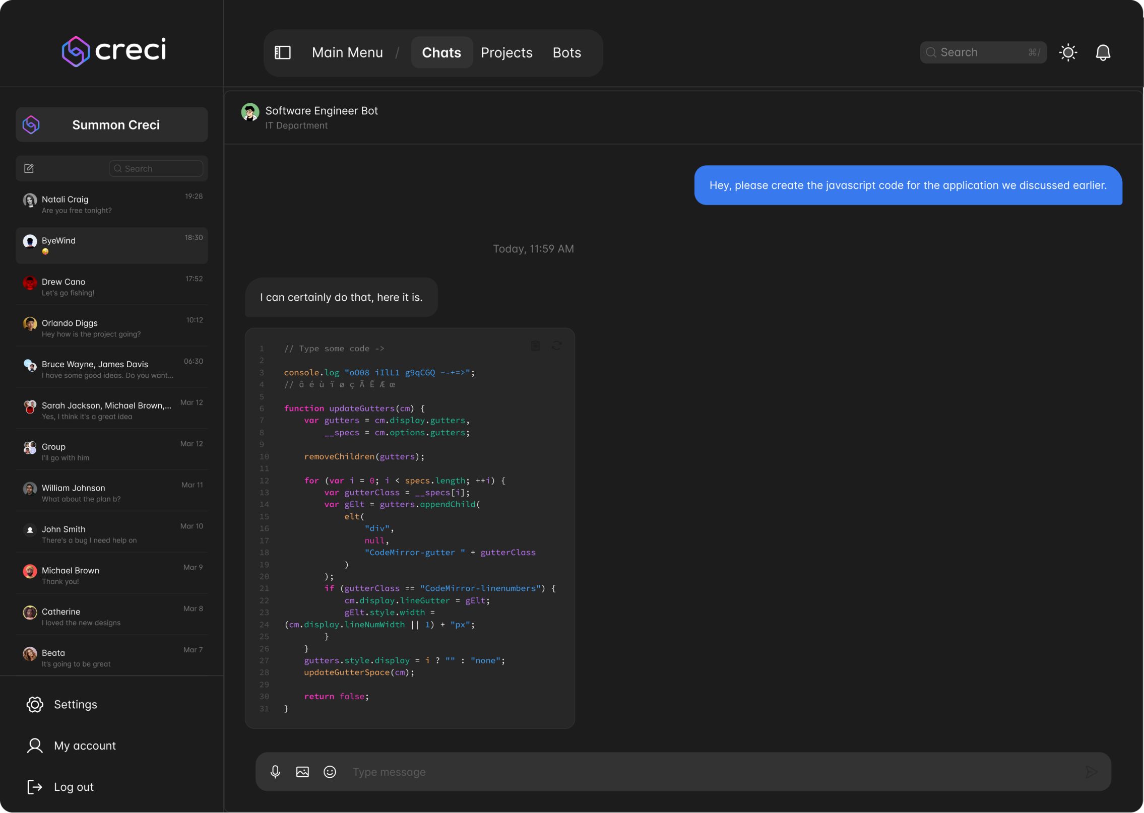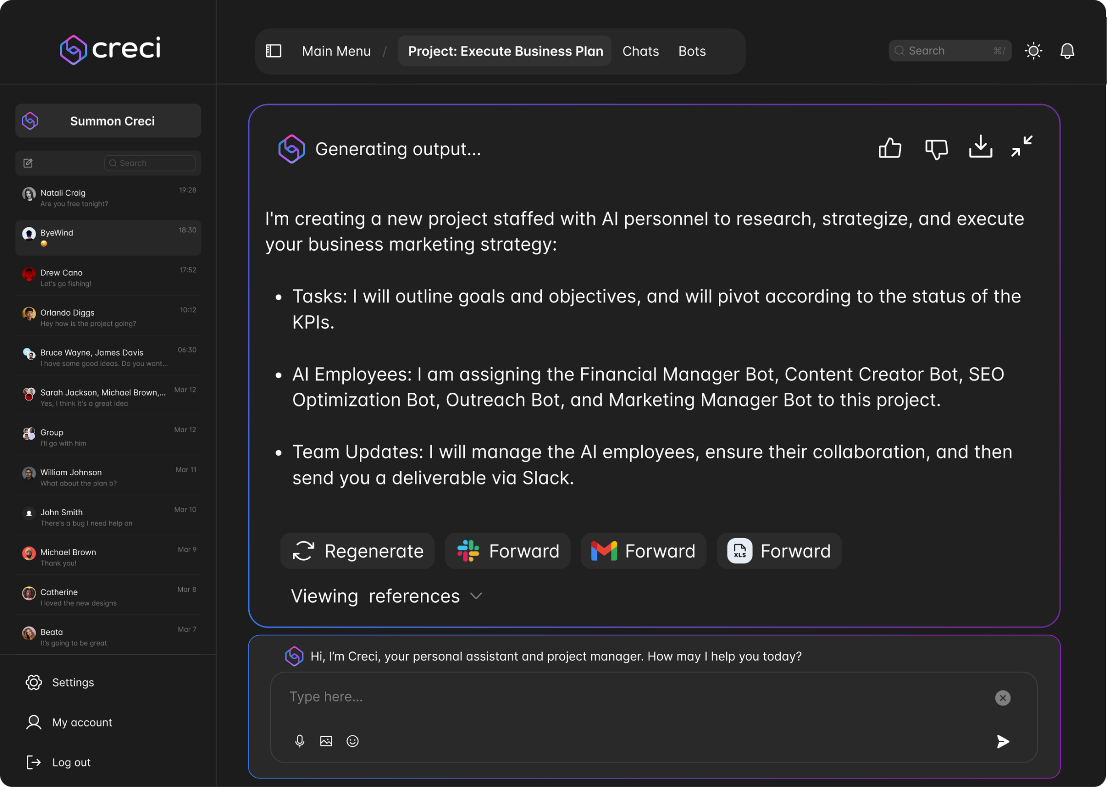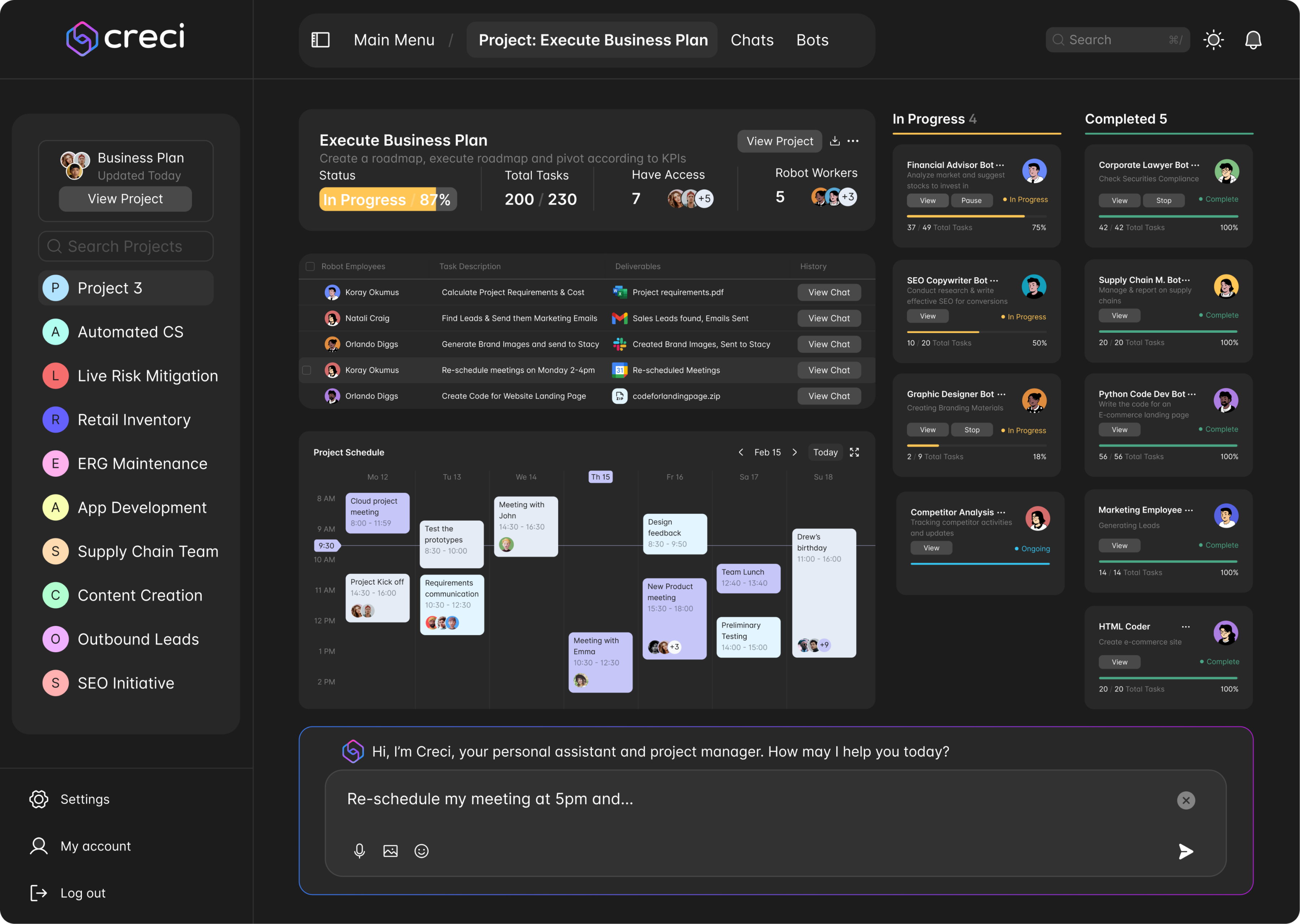 What sets Creci apart is its ability to take your ideas or project requirements and autonomously bring them to fruition. It can lead teams, and if needed, create new bots using permissible company data. This hands-off approach means you can instruct Creci to undertake significant projects, and it will manage all aspects from start to finish. Progress can be monitored via a CRM-like dashboard, providing a transparent view of the developments or you can directly ask Creci for updates.